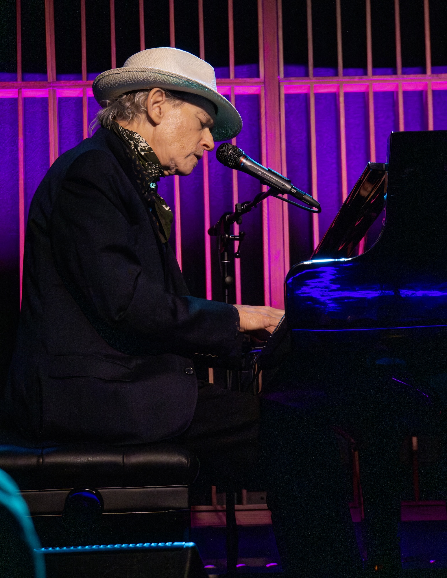Accordingly, the room at Garcia’s was full of fans expecting a special evening from one of popular music’s finest and most distinctive keyboardists. Tench delivered, connecting via stories and emotive performances that centered upon the songs and tone of his new album The Melancholy Season. Sitting alone at a Yamaha grand piano in a black suit, neckerchief, and white fedora, Tench performed songs that paid tribute to his influences, touched on his musical legacy, and revealed where he is today. The performance also represented a triumph over personal adversity.
